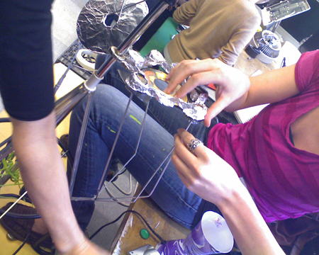 My group consisted of Michelle, Hildawg & me. Here’s our awesome drum-set we made. We started out experimenting with some ideas, but after testing the stuff we had I learned that some of the old junk worked better for this project then the others. I tried to build a computer from scratch for input to a digital monitor interface but the power supply didn’t work. So we had to abandon that idea. We tried to use an old Mac processor fan to make a wind chime but it turned out to be quite dangerous as a musical instrument that created flying metallic projectiles with strings attached. So we just decided to make it an old fashioned analog wind chime.